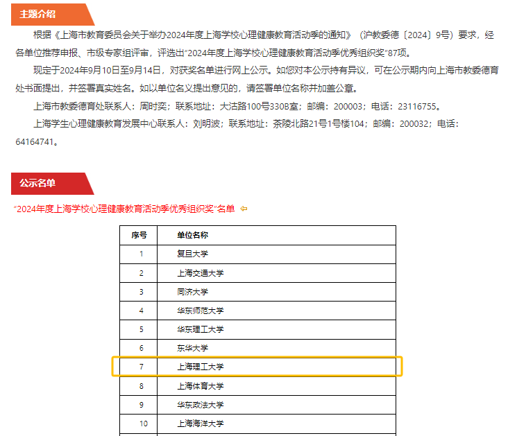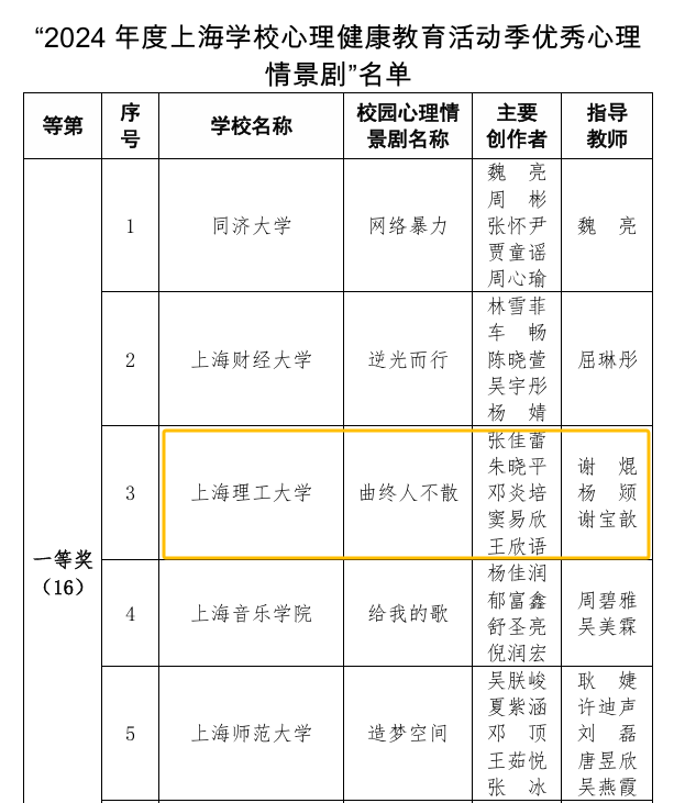 近日,由上海市教委德育处、上海学生心理健康教育发展中心主办的2024年度上海学校心理健康教育活动季获奖名单揭晓,金沙官网在本次活动季中表现突出,获“2024年度上海学校心理健康教育活动季优秀组织奖”。心理中心指导的心理情景剧作品《曲终人不散》,获活动季优秀心理情景剧一等奖(全市仅5所高校获一等奖)。