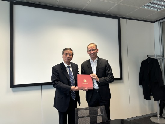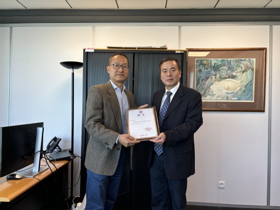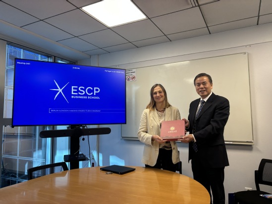 代表团首站抵达欧洲高等商学院,受到了国际关系部主任Marina Lecomte及大数据与商业分析系主任周炜教授的热烈欢迎。盛春与Marina Lecomte就商科教育、学生培养及师生互访等议题进行了深入探讨,并正式向周炜教授颁发了客座教授聘书。代表团还参观了校园设施,与学生和教师就课程质量、学习生活费用及未来发展等话题进行了友好交流。