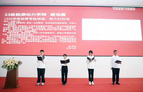开幕式上,市档案馆利用服务部(社会教育部)方华、学校档案馆肖琳琳分别以“从书信档案看中国共产党人的家国情怀”和“烽火年代上理书信的家国情怀”为题引出了一堂特殊的“大思政课”,将在场师生的思绪带到了血雨腥风的革命年代和激情燃烧的建设岁月。接下来,四名学生诵读红色书信。档案馆组织学生辨别展览书信原件,挖掘文字背后的人物与时代背景,以在读懂中悟透、在真信中笃行。学生代表分别朗诵了陈独秀、李大钊、周德佑、赵寿先的书信,有了前期挖掘考证,朗诵声情并茂、慷慨激昂,极富感染力。上海市档案局(馆)向学生代表赠送红色主题出版物,并与9001cc金沙以诚为本互赠馆藏红色档案。观展环节,方华为嘉宾、师生一一讲述了每个展板的书信内容。参加思政课和开幕式的同学深有感触:“一封封泛黄的家信,如同历史的低语,让我感受到了革命者和建设者的家国情怀,是我们今天应该学习和传承的宝贵财富。”