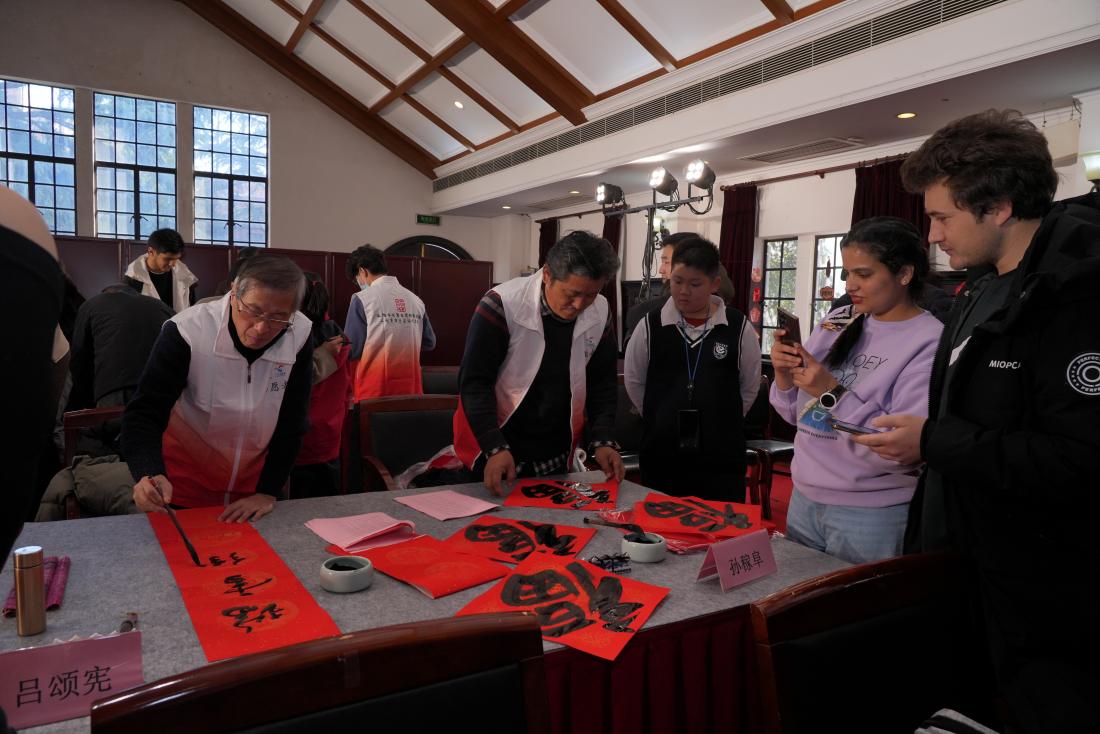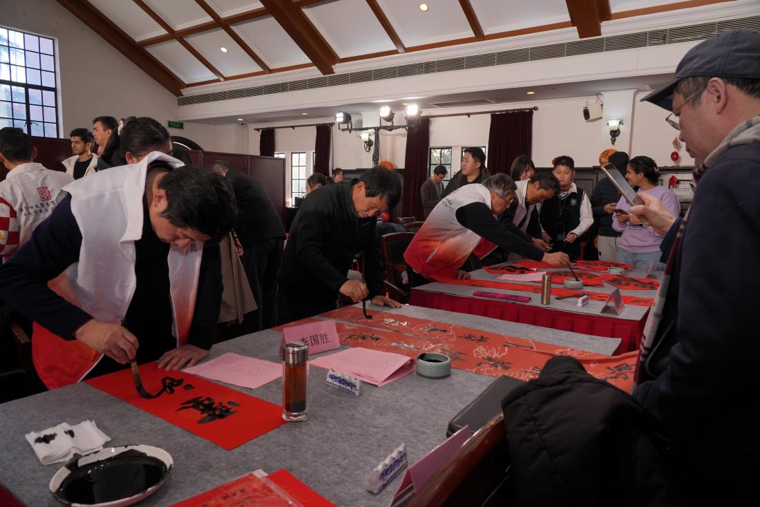 1月17日下午,上海市书法家协会代表团走进9001cc金沙以诚为本,在音乐堂挥毫泼墨,为金沙官网师生书写春联传递情谊,共同喜迎乙巳新春。金沙官网美育中心主任、沪江学院常务副院长陈红,美育中心专职副主任、沪江学院副院长朱慧锋,沪江学院教师以及中外学生代表出席活动,沪江学院书法教师董剑戟主持活动。