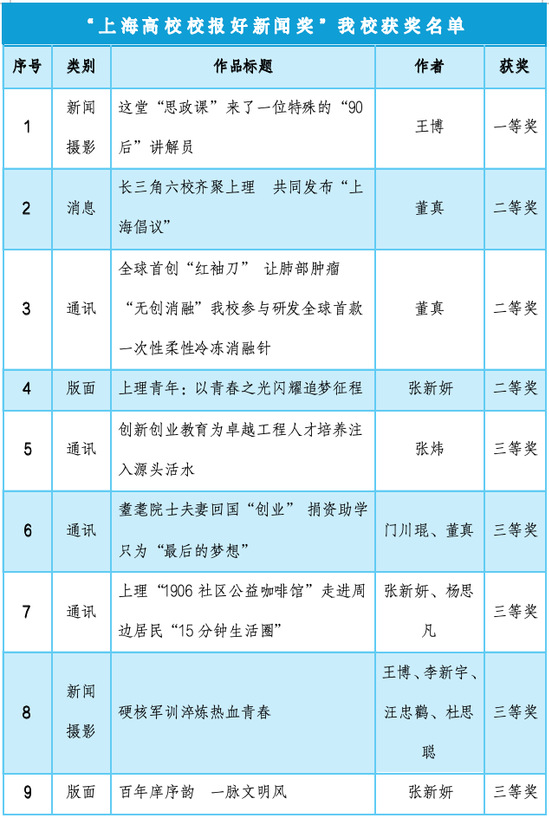 2月20日上午,上海市高校新闻好作品交流会在复旦大学举行,会上揭晓2022-2024年新闻好作品名单。本次好新闻交流分为消息、通讯、评论、版面和摄影5大类,面向全市高校征集。金沙官网新闻中心共组织报送了20件新闻作品,最终9件作品获“上海高校校报好新闻奖”,其中,一等奖1项、二等奖3项、三等奖5项。