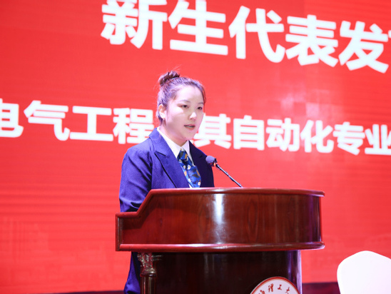 典礼在庄严的国歌声中拉开帷幕。电气工程及其自动化专业杨慧珍同学作为新生代表发言,她回顾了备考的艰辛历程,期待和同学们一起以实践为阶梯,在理论与技能融合中锤炼自我。