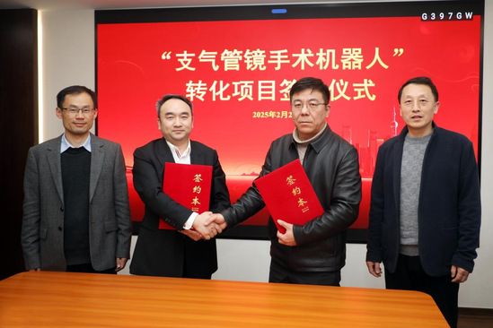 2月28日下午,光电学院王亚刚教授的“支气管镜手术机器人”转化项目与桐轩集团合作的签约仪式举行。桐轩集团董事长沈坤、集团高管,学校科研院院长刘宝林、光电学院副院长刘一及相关人员出席会议。