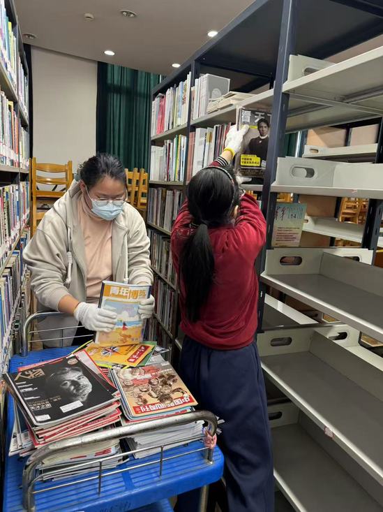 图书馆馆员首先为志愿者们概述了图书馆的馆藏现状,其后详细介绍了图书、期刊、毕业论文等纸质馆藏文献和自修室的管理流程以及服务规范。随后,学生志愿者分组投入到图书馆流通部、期刊部、信息部及南校图书馆等相关部门的志愿活动中:擦拭书架和桌椅,进行卫生清洁,保持图书馆馆舍干净整洁;整理图书和期刊,将乱序图书按照索书号排序,方便师生查找资料;回收自习位无人认领图书,把收纳区还给有需要的读者;毕业论文整理上架,年度期刊下架装订,协助文献归档保存……志愿者们齐心协力,有条不紊地完成了各自任务,以实际行动践行了雷锋精神。