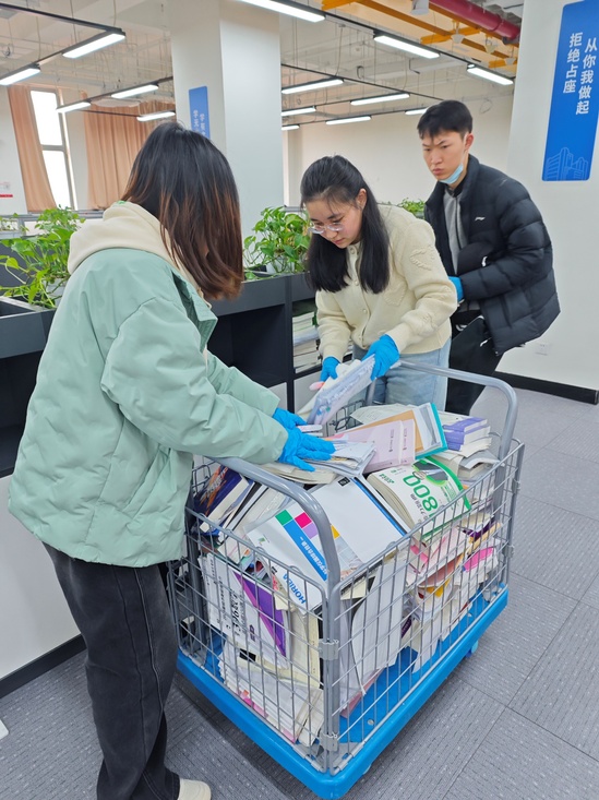 学生志愿者清理自修室无人认领图书