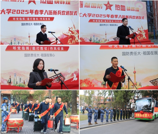 3月6日上午,2025年春季应征入伍新兵欢送仪式在刘湛恩烈士故居红色文化主题馆前广场举行,校党委副书记、副校长刘德强,基础学院党委书记李琴,学生工作部(处)副部(处)长刘伟出席活动,各学院学生工作负责人、辅导员、班主任、退伍老兵和新兵家长代表共同参加欢送仪式。仪式由学生工作部(处)副部(处)长、武装部副部长曹桂馥主持。
