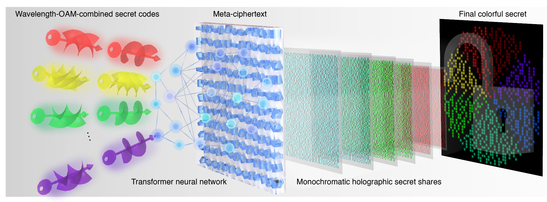 如何让一张全息图承载上百幅图像?研究团队给出的答案是“AI赋能光学设计”。传统全息图设计依赖低效率的迭代优化算法,团队利用Transformer神经网络,对单张纯相位全息图进行全局优化设计,应用于具有宽波段响应能力的纳米超表面全息图,使其能够同时感受入射光波长与轨道角动量的双重变化。简单来说,就像为光波打造了“智能筛网”,仅允许特定颜色和螺旋程度的光通过,从而在可见光范围内实现了2纳米超窄线宽的高精度筛选。“AI为光雕刻出118把不同的钥匙,每把钥匙只能打开特定的信息宝库。”孟维佳比喻道。实验显示,该技术的信息加密安全性较传统方法提升超过2500倍,即使截获全息图,若未掌握密钥对应的波长与涡旋参数组合,也无法破解原始信息。这种“视觉密码术”已在高安全级数据存储、防伪标识等领域展现应用潜力。