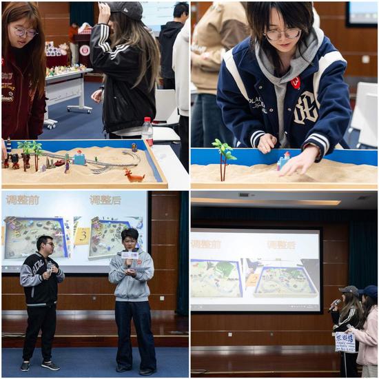 分组后,同学们迎来了本次活动的核心环节——沙盘游戏。在老师引导下,同学们围坐在沙盘周围,开始了心灵的探索之旅。同学们在沙盘中自由创作,构建出一个个充满想象力和创造力的沙盘世界。随后,同学们在小组内分享自己的沙盘作品,讲述其中的故事和寓意。带队老师也适时地对同学们的沙盘作品进行解读和引导,帮助同学们深入挖掘内心深处的情感和想法,进一步提升了同学们的自我认知和心理调适能力。