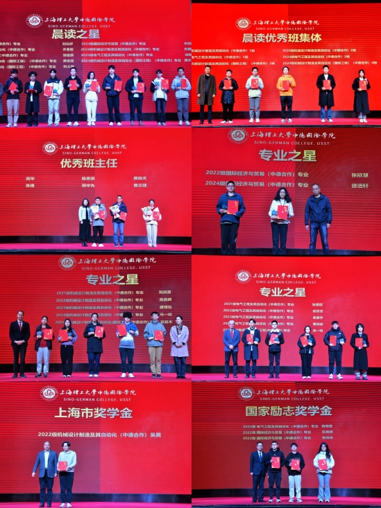 本次表彰大会共计颁发了中德国际学院晨读之星、晨读优秀班集体、优秀班主任、专业之星、上海市奖学金、国家励志奖学金、国家奖学金、中德之星八个奖项。中德之星的获得者李雪婷作为学生代表上台发言,她以“突破、沉淀、担当”三个成长的关键词与大家分享了大学生活,鼓励大家勇于踏出第一步,要耐住寂寞,向下扎根,希望能和大家一同作为中德国际学院优秀的学子,担负起新时代青年的使命任务。德方教授Prof.Gärtner以“从婴儿到成人”的成长历程为喻,强调“每一次选择塑造未来自我”,他结合德国严谨治学传统,提出“行为塑造人格”的深刻观点,呼吁学生主动规划人生目标,以学风建设为基石实现自我蜕变。