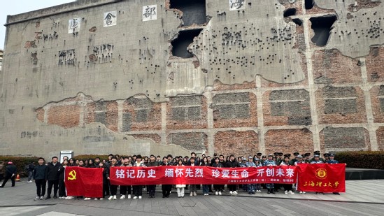 完成高桥烈士陵园祭扫后,金沙官网师生专程前往上海四行仓库抗战纪念馆,重温那段可歌可泣的抗战历史。活动前,学校退役军人服务站组织退伍学生集体观看电影《八佰》,深入了解先辈们在四行仓库坚守阵地、誓死抗敌的悲壮事迹。到达四行仓库抗战纪念馆西侧山墙前,全体师生整齐列队,脱帽鞠躬致敬,并敬献白花,表达对抗日烈士的无限敬仰。在参观过程中,同学们深受震撼,纷纷表示被先烈们英勇无畏精神所感染。