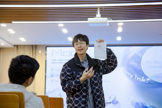 3月28日,收官之讲为校友创业分享。学院2015级校友、星墨StarryInk品牌创始人余昊源以“让世界‘写’满中国色彩:墨水品牌的创新与破圈为题”,分享自己从校园实验室到国际市场的创业征程。余昊源给同学们展示产品研发手稿、海外参展影像等资料,生动复盘了个人心路历程与企业战略转型过程,着重分享摘得国际奖项的“冷萃墨水系列Cold Brew Ink”,成功将植物天然染料萃取技术与现代色彩美学深度融合,不仅开创了墨水制造新范式,更打造出文化输出的创新样本。互动环节中,余昊源立足创业者视角,为在校生解析职业发展路径,系统梳理创业团队角色分工,并针对0到1创业阶段的关键问题给予实操建议。
