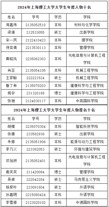 综合评审会评分与网络投票情况,最终评选出了2024年上海理工大学大学生年度人物10名,9001cc金沙以诚为本大学生年度人物提名10名。