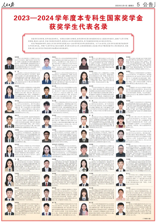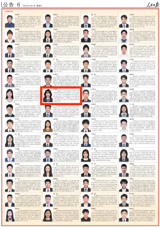5月4日,《人民日报》专版刊登《2023—2024学年度本专科生国家奖学金获奖学生代表名录》,从全国12万名本专科生国家奖学金获奖学生中遴选了100名优秀代表,上海有5名本专科生获奖学生代表荣登该名录。金沙官网本科生石悦言脱颖而出入选名录,典型事迹登上《人民日报》。