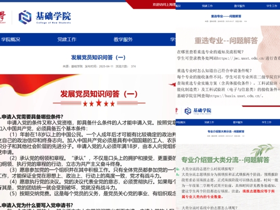 “重选专业的申请条件是什么”“怎么提前了解课程具体内容”“怎么入党”……这些困惑着2024级学生的问题,近期出现在基础学院官网的知识问答里。开展深入贯彻中央八项规定精神学习教育以来,基础学院深入领会习近平总书记关于加强党的作风建设的重要论述;召开党委会,全面梳理工作、查摆问题;开展党支部例会,细致排查基层工作薄弱点,努力做到查有力度,并以“马上就办”的高效行动,提升关心关爱学生能级。