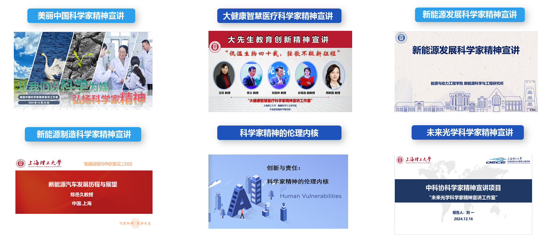 2024年金沙官网“弘扬科学家精神 培养卓越工程人才”首次获批中科协科学家精神宣讲项目。立项后学校高度重视,在全校范围里梳理和整合资源,开发了6门宣讲课程,分别是未来光学科学家精神宣讲、新能源发展科学家精神宣讲、大健康智慧医疗科学家精神宣讲、智能制造科学家精神宣讲、美丽中国科学家精神宣讲、科学和工程伦理科学家精神宣讲。由3名院士、16名教授、9名副教授等28人组成的宣讲队伍进行主讲。为确保组织有力,学校成立6个子项目工作室推进落实相关工作,工作室均由院士或子项目所在学院分管副院长担任工作室负责人,遴选宣讲团队、开发课程大纲、撰写讲解文本、制作PPT。经过历时10个月,由上海市科协和学校党委宣传部、马克思主义学院专家指导下的多轮打磨,课件日臻成熟,并录制成慕课,便于广泛传播课程内容。