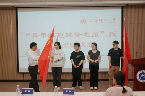 在启动仪式之后,举行了“青年红色筑梦之旅”社会实践活动授旗与出征仪式。张华亲手将队旗授予4个“青年红色筑梦之旅”项目团队,并嘱咐他们要不忘初心、牢记使命,传承红色基因,将创新创业与服务社会紧密结合,为乡村振兴贡献自己的力量。