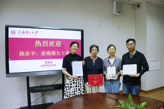 在参观后的座谈中,陈亦平与涂海燕女士对档案馆的接待以及多年来重视研究和传播陈立校友和涂长望校友的科学成就和革命事迹表示感谢,并捐献了陈立校友回忆沪江时期参加革命斗争经历的手稿以及《陈立先生纪念文集》《陈立心理科学论著选》等珍贵资料。