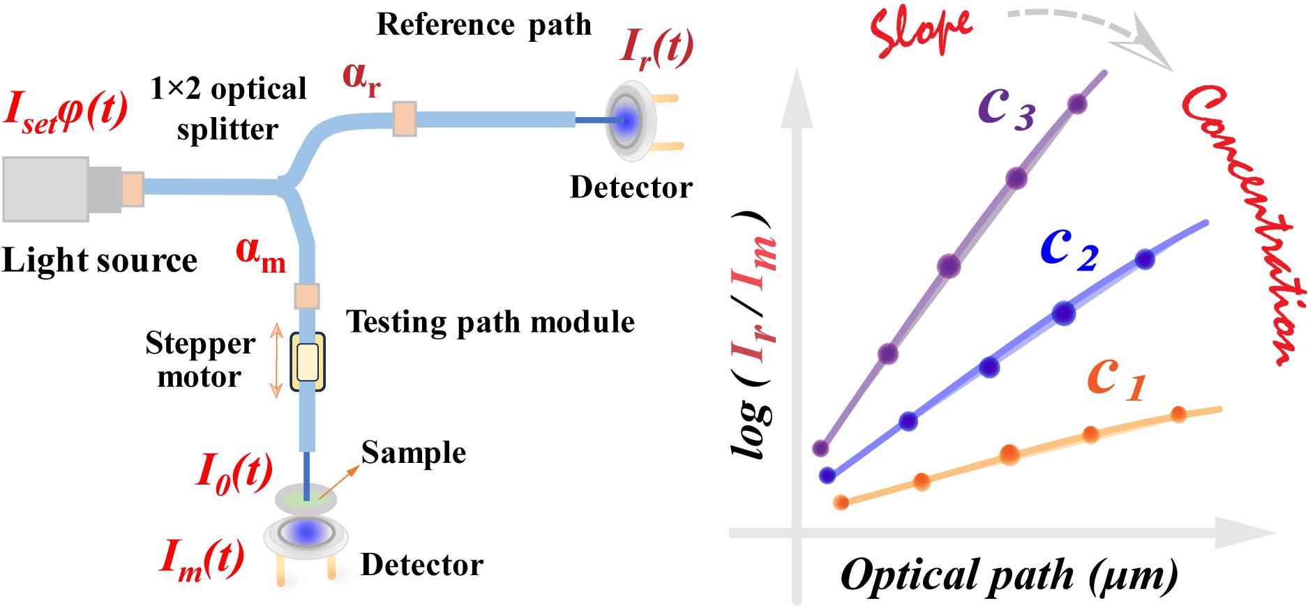 浓度测量是化学分析、水质监测、药物研发等领域的核心技术。传统基于比尔-朗伯定律的吸光光度法依赖固定光程测量样品对特定波长的吸光度,检测动态范围窄,无法测量高浓度溶液。研究团队构建了高精度测量实验原理机,通过引入参考光路实时校正光源波动,在0~20 μm超短光程范围内采集5组光信号,仅在800 ms内即可实现对超高浓度液体的超大动态范围高精度测量。检测性能显著优于两款商用光度计,彻底解决了高浓度样品“测不了”的难题,突破了高浓度溶液直接检测的技术瓶颈,为我国高端分析测量仪器研发提供了“上理方案”。