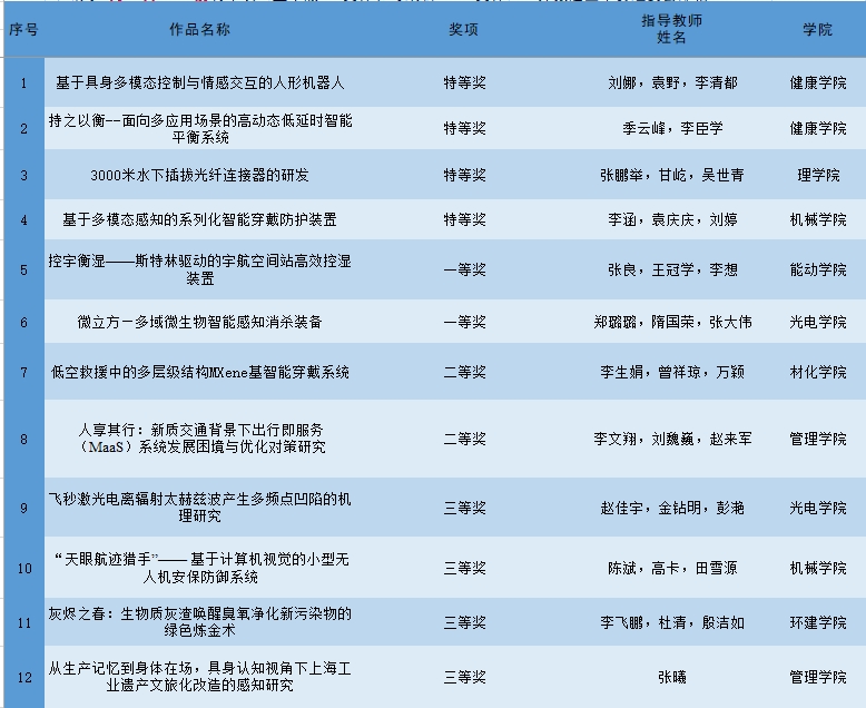5月23至25日,第十九届“挑战杯”上海市大学生课外学术科技作品竞赛决赛在上海工程技术大学松江校区举行。上理工共报送14项作品进入市级复赛,经过激烈角逐,最终获特等奖4项、一等奖2项、二等奖2项、三等奖4项,总成绩位列上海市高校第7名,连续六届捧得“优胜杯”,特等奖获奖数量创历史新高。