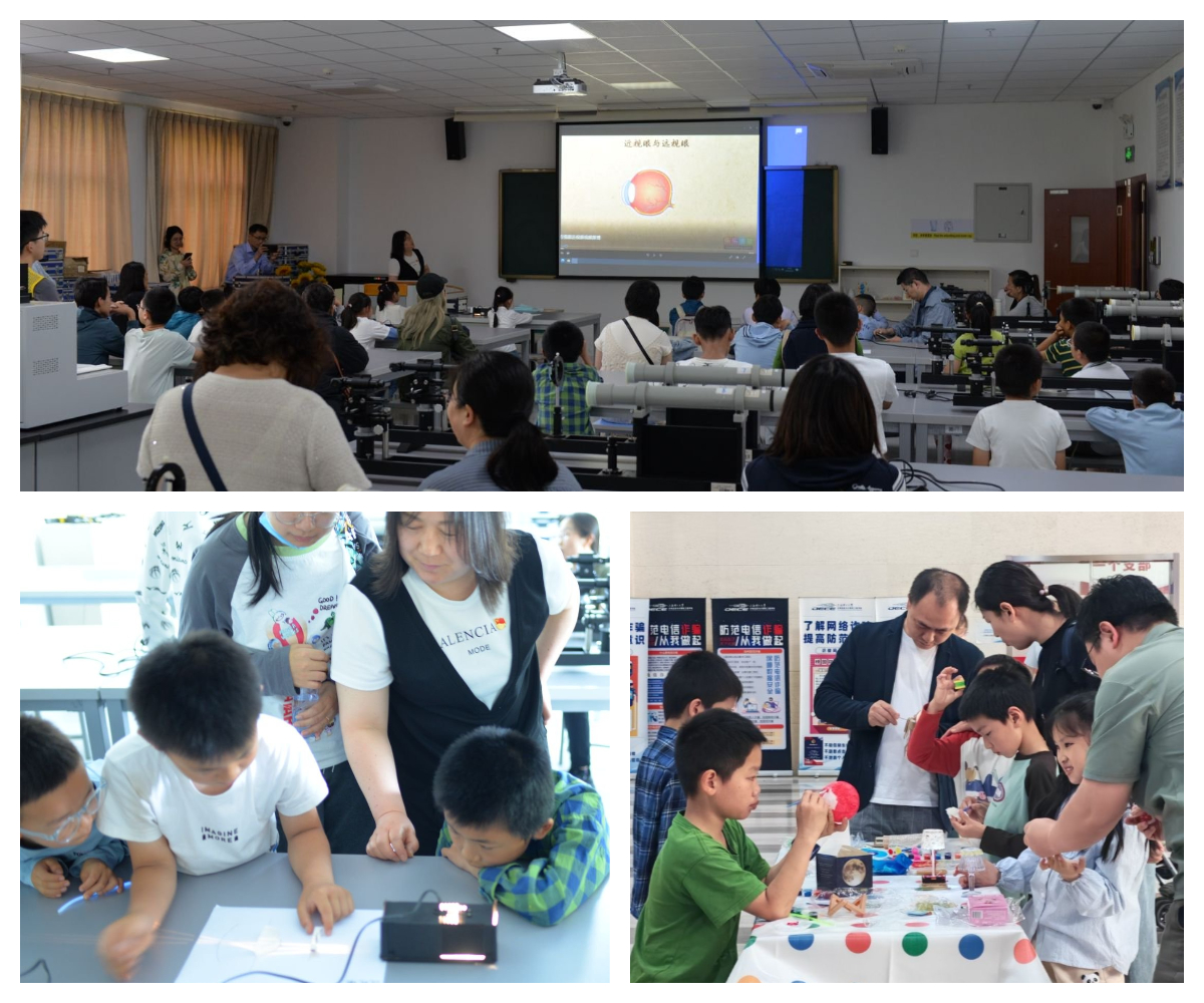在光电信息实验中心教师志愿者的引导下,大家有序参观了本科实验教学中心。在方宝英老师的指导下,小朋友们进行了“近视眼和远视眼的形成及其矫正”光学趣味小实验。小朋友们不仅轻松理解了光学矫正的原理,更深刻意识到保护视力的重要性。此外,“显微镜”“潜望镜”“投影灯”“台灯”等生活中常见物品的光学原理探究活动,小朋友们通过动手组装直观感受到光学反射、折射原理在日常生活中的应用,锻炼了动手能力和创造力,深刻体会到了“科技让生活更美好”的真谛。