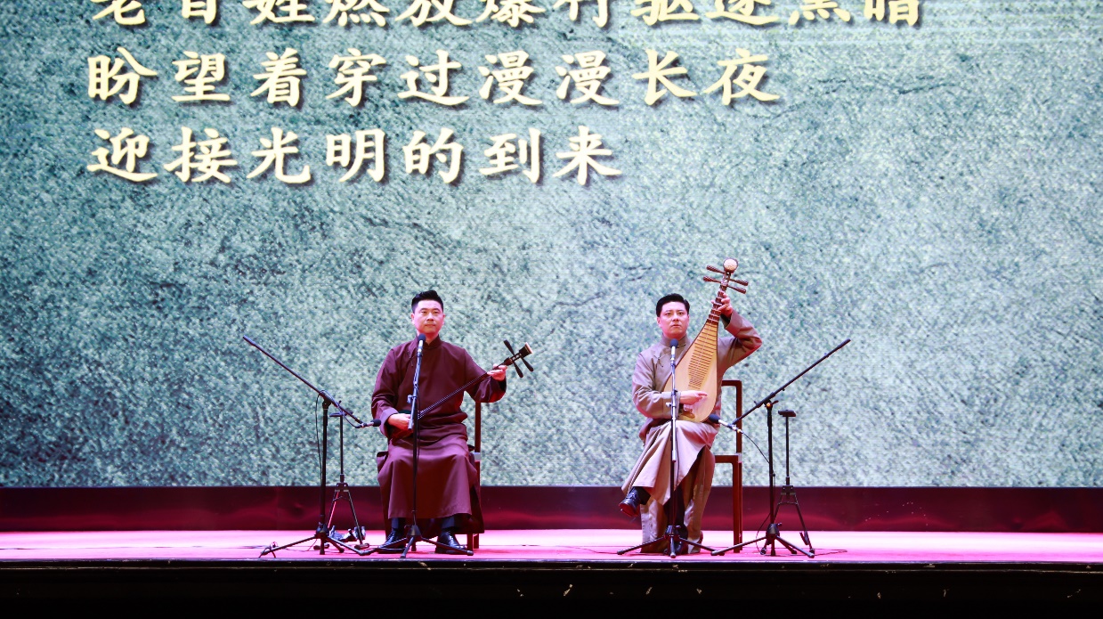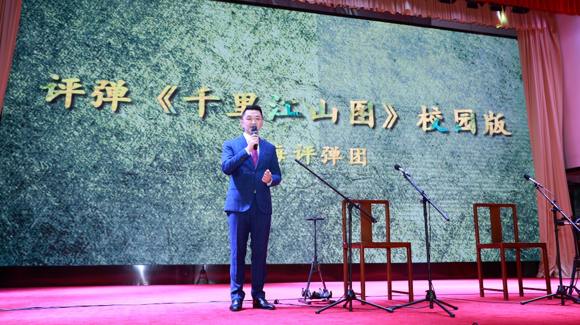 演出开始前,上海评弹团团长高博文以艺术导赏的形式,介绍了以评弹艺术为代表的非遗文化的活态传承和创新发展。五位国家一级演员以扎实的功底和细腻的表演,将评弹“说噱弹唱演”的艺术特色展现得淋漓尽致。琵琶的清脆、三弦的醇厚,交织出动人的旋律,为紧张的剧情增添了一抹柔情;吴侬软语的诉说,或激昂、或婉转,生动地刻画了一个个鲜活的人物形象。在表演中,演员们巧妙运用“噱”的艺术手法,为紧张的战情节增添了诙谐幽默的元素,让观众在欢笑中感受到革命先辈们乐观向上的精神品质。在演绎英雄们的英勇事迹时,演员们又以深情的唱腔和真挚的情感,引发了观众的强烈共鸣。师生们沉浸在评弹的世界里,感受革命先辈们为了国家独立、民族解放所付出的巨大牺牲。