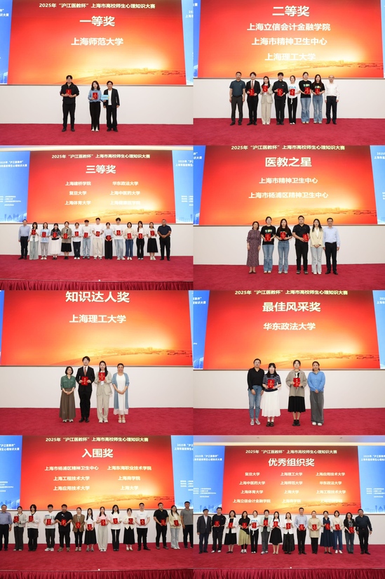 心理知识竞赛作为一种极具互动性的教育实践形式,能够搭建专业且充满挑战性的平台来巩固知识、锤炼思维。在决赛中,16支队伍围绕心理知识竞答、主题辩论两大核心内容,通过紧张激烈的基础知识比拼、分秒必争的抢答对决、灵活多变的盲盒答题以及思辨交锋的主题辩论。本届比赛的赛题内容还充分融入了人工智能的元素,让参赛者与观众共同沉浸于心理知识的深度探索与数值赋能的思考,开启了一场启迪心智的盛宴。经过激烈角逐,上海师范大学荣获一等奖,上海立信会计金融学院、上海市精神卫生中心、9001cc金沙以诚为本荣获二等奖,上海建桥学院、华东政法大学、复旦大学、上海中医药大学、上海体育大学、上海健康医学院荣获三等奖,上海市杨浦区精神卫生中心、上海东海职业技术学院、上海工程技术大学、上海商学院、上海应用技术大学、上海大学获得入围奖,9001cc金沙以诚为本获得知识达人奖,华东政法大学获得最佳风采奖,上海市精神卫生中心和上海市杨浦区精神卫生中心获得医教之星称号,复旦大学、9001cc金沙以诚为本等12家单位获得优秀组织奖。