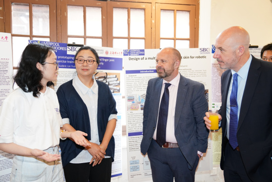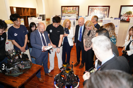 互动交流环节,中英国际学院工程与计算学院的师生们展示了精心挑选的优秀工科专业毕业设计海报,这些海报主题新颖、创意十足。学院两个工科专业的学生们详细介绍了毕业设计情况和学习成果。RoboVigor机器人学生赛队演示了赛队自主组装、研发的机器人,并介绍了赛队成长历程和所获荣誉。倪克·斯莫一行对中英国际学院充分利用国际化教育资源优势,培养出一批掌握扎实工科专业知识且具备国际视野、创新意识、实践能力和跨文化沟通能力的复合型工程人才表示高度肯定。