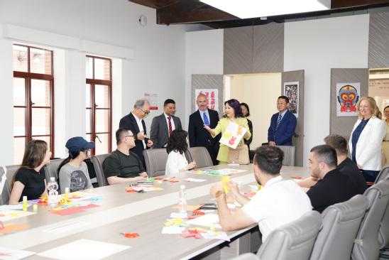 利物浦约翰摩尔大学国际部主任、利物浦中国合作组织副主席王懿博士,工程学院院长克里斯蒂安·马修(Christian Matthews)博士,工程技术学部外事副主任罗宾·派恩(Robyn Pyne)博士,在中英国际学院班子成员的陪同下参观复兴路校区校史馆,与正在体验中国剪纸的、参加学院2025年国际夏校的利物浦约翰摩尔大学学生交流。