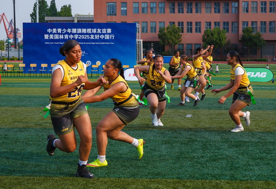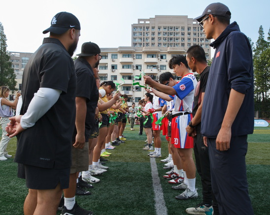 比赛开始前,双方队员进行了混合组队的热身训练。通过简单的传接球和战术配合练习,大家迅速拉近了彼此的距离,现场气氛轻松活跃。在比赛开幕式上,傅继红向主裁判授球,蔡永莲主持了抛硬币选边仪式。随着裁判哨声的响起,这场跨越太平洋的友谊赛正式拉开帷幕。腰旗橄榄球是一项兼具智慧与活力的运动,以拔取对方腰旗代替身体冲撞,更具安全性和趣味性。赛场上,中美队员全力以赴,配合默契,展现出精湛的技艺;赛场下,两队球员相互拥抱致意、互赠纪念品,温情互动诠释了“友谊第一,比赛第二”的体育精神。