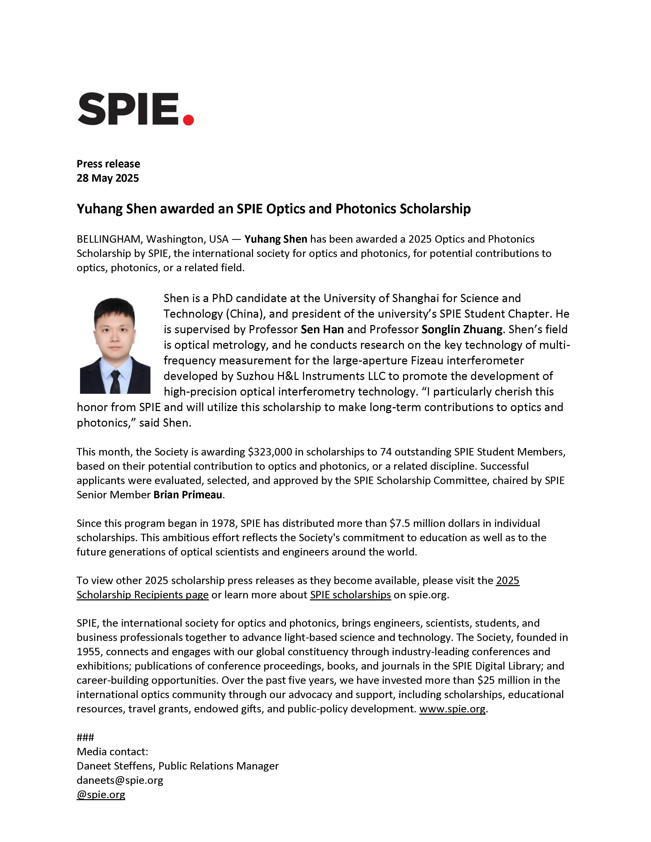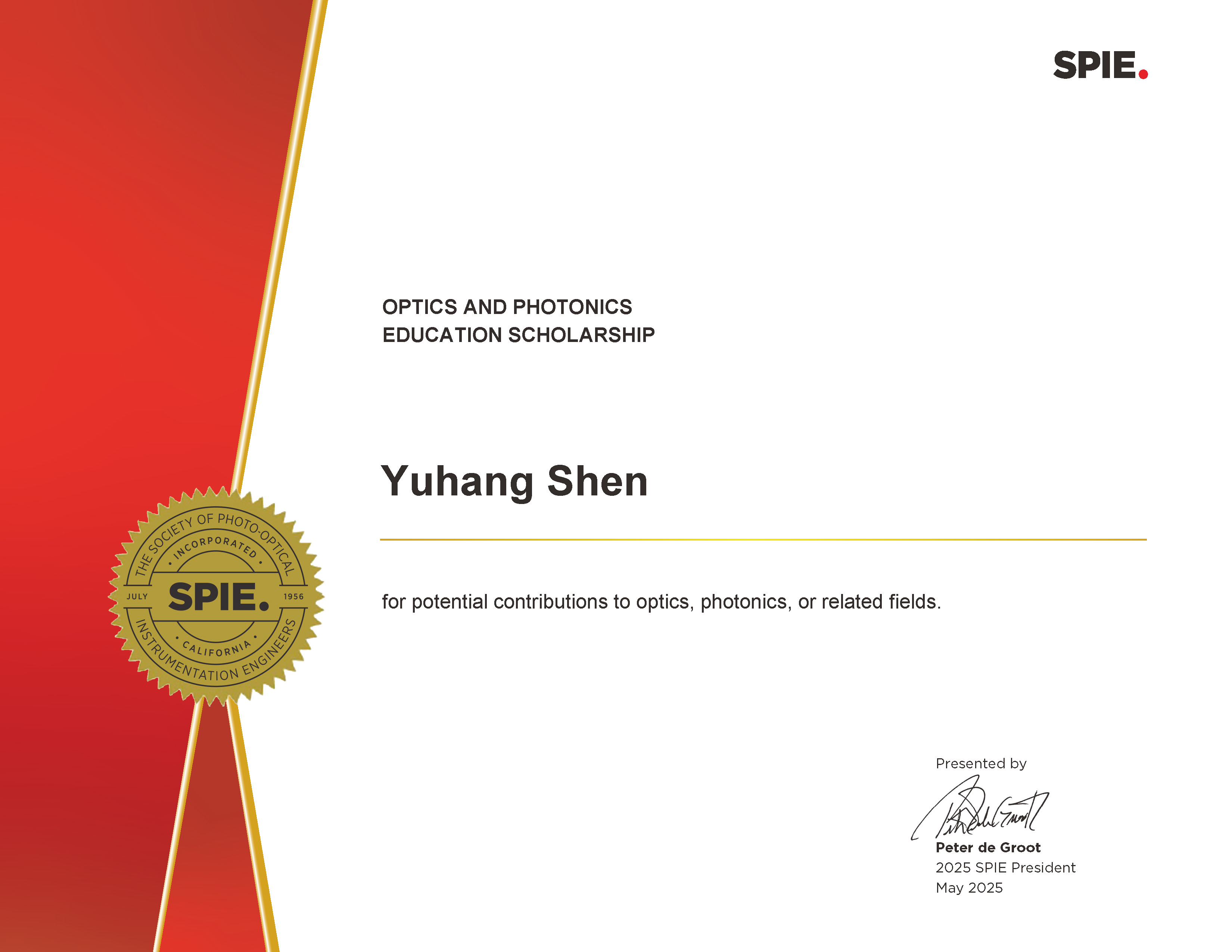 5月28日,SPIE(国际光学工程学会)向全球74名杰出的SPIE学生会员(中国学校共9名获奖者)颁发了总计323,000美元的奖学金,以表彰他们在光学和光子学或相关领域的潜在贡献。9001cc金沙以诚为本光电信息与计算机工程学院庄松林院士领导的韩森教授团队博士研究生沈宇航同学荣获SPIE光学和光子学奖学金。