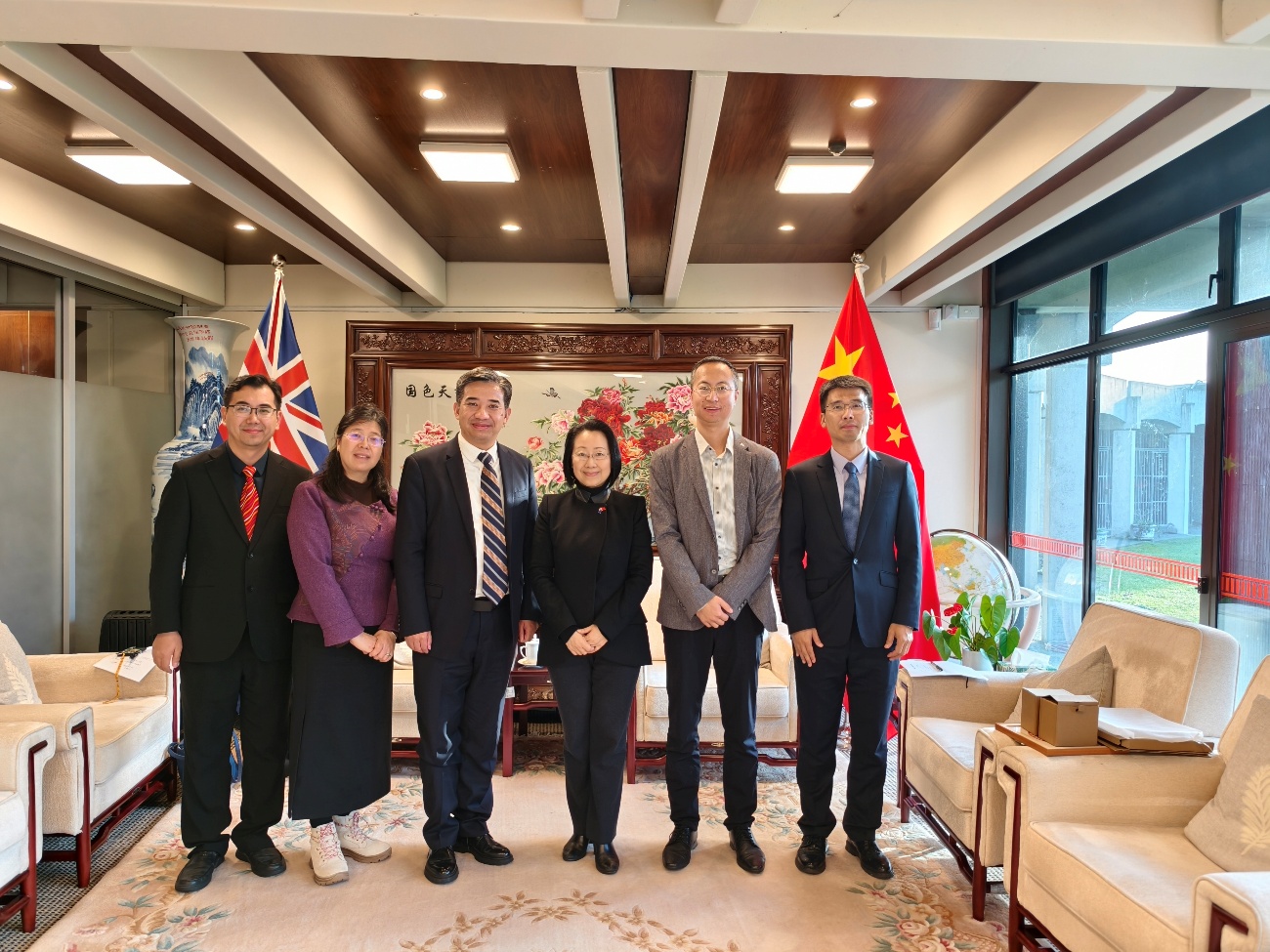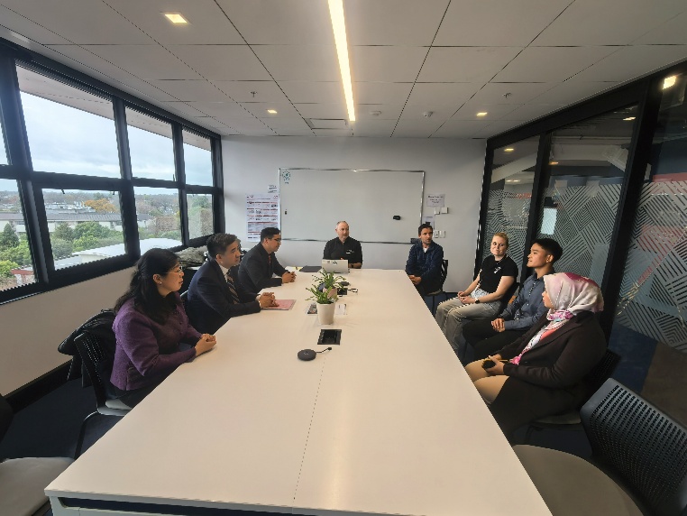 访问团最后前往中国驻新西兰基督城总领馆拜访了总领事何颖和教育领事申健,岳海洋介绍了学校建设发展情况,学校与新西兰惠灵顿理工学院、维特利亚国立理工学院、坎特伯雷大学校际合作情况。何颖代表总领馆对岳海洋来访表示欢迎,介绍了中新交流的历史,着重推介了为中西友好做出重要贡献的国际友人路易·艾黎,她希望学校进一步拓展与新西兰其他高校在教育科研的合作。