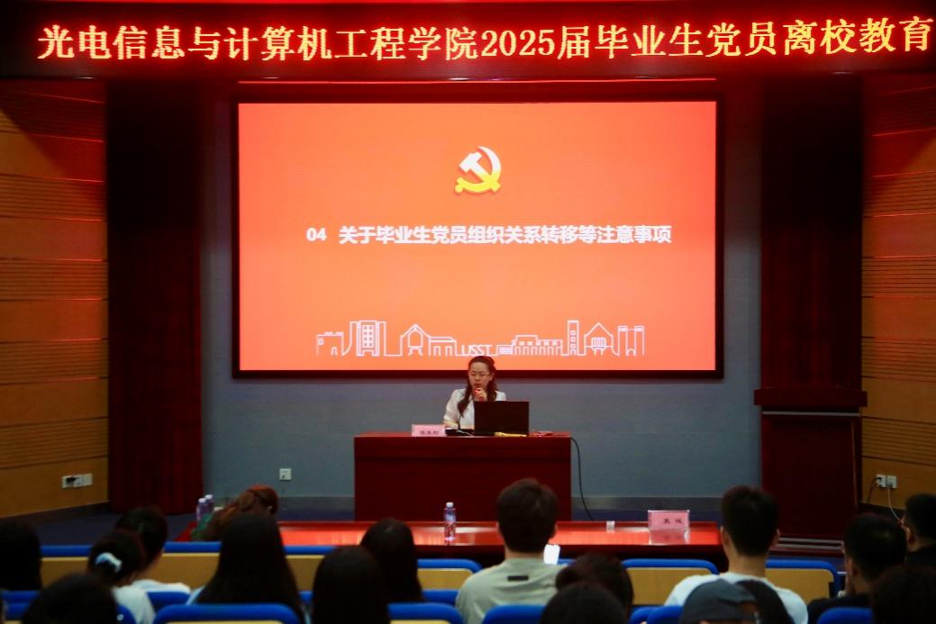 为加强毕业生党员党性修养,强化使命担当,引导同学们在新征程中继续发挥先锋模范作用,6月17日下午,光电学院开展2025届毕业生党员离校教育活动。学院党委书记、副书记、专职组织员、学生党支部书记和全体毕业生党员参加。