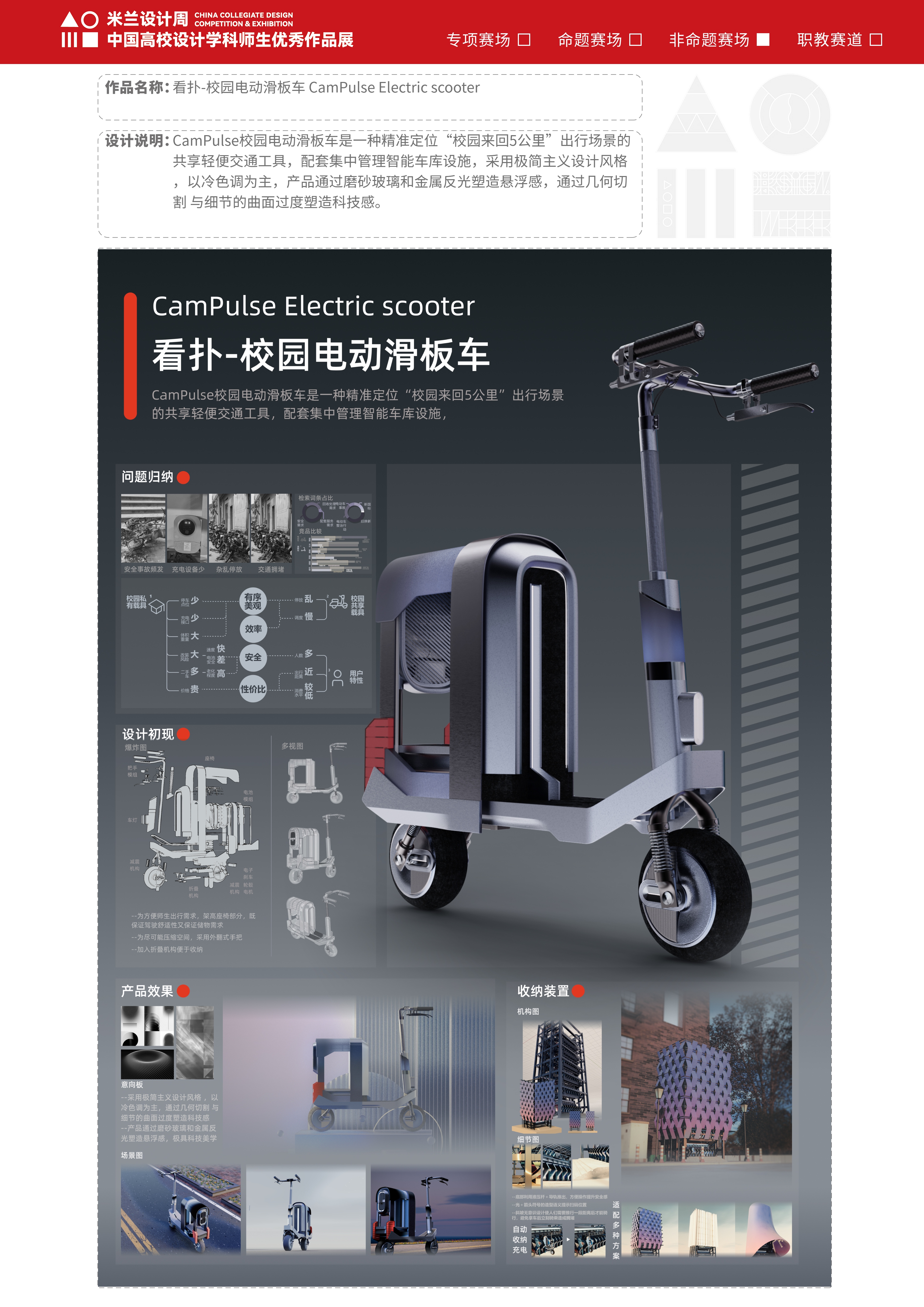 作品说明:CamPulse校园电动滑板车是一种精准定位“校园来回5公里”出行场景的共享轻便交通工具,配套集中管理智能车库设施,采用极简主义设计风格 ,以冷色调为主,产品通过磨砂玻璃和金属反光塑造悬浮感,通过几何切割与细节的曲面过度塑造科技感。