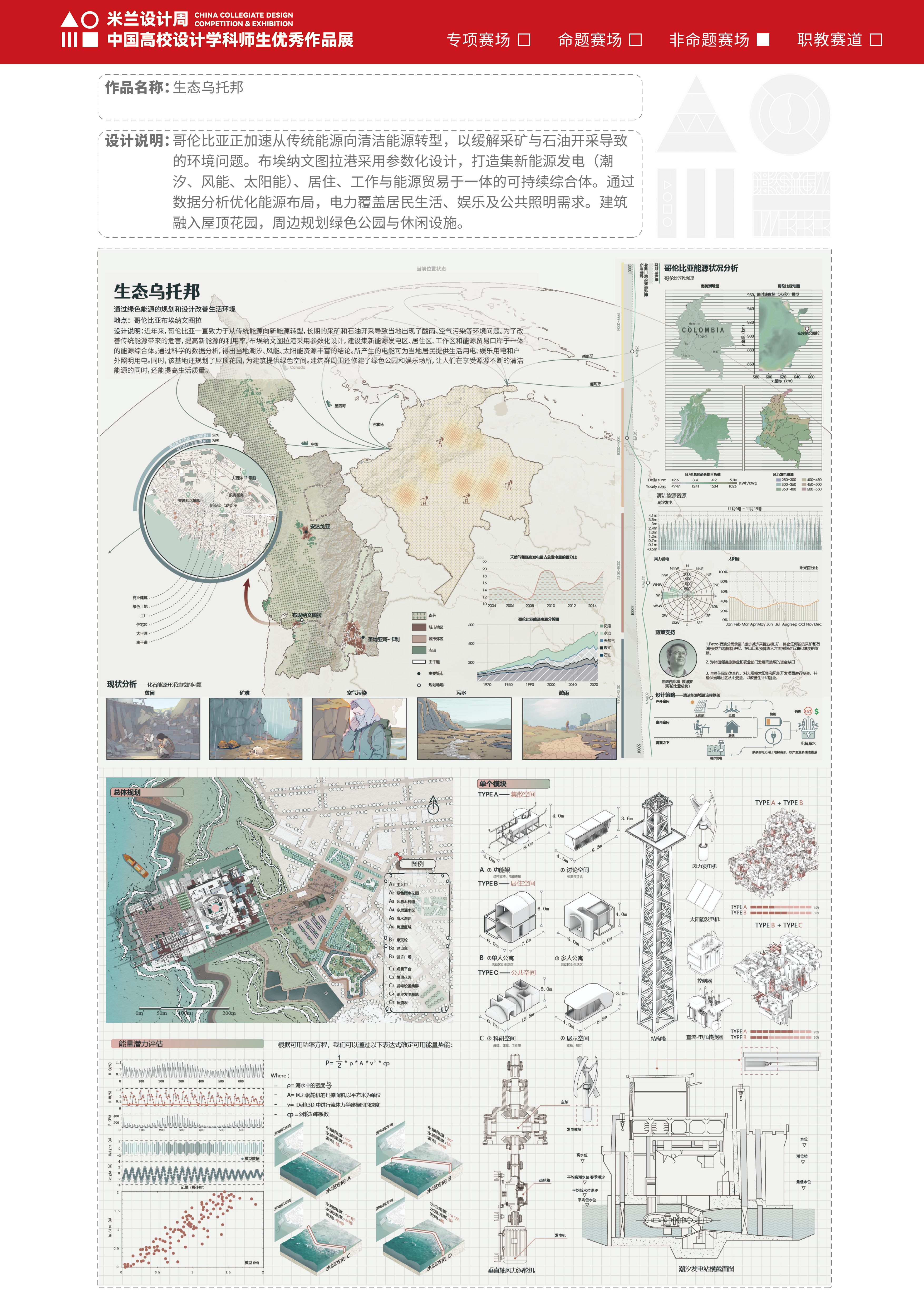 作品说明:哥伦比亚正加速从传统能源向清洁能源转型,以缓解采矿与石油开采导致的环境问题。布埃纳文图拉港采用参数化设计,打造集新能源发电(潮汐、风能、太阳能)、居住、工作与能源贸易于一体的可持续综合体。通过数据分析优化能源布局,电力覆盖居民生活、娱乐及公共照明需求,建筑融入屋顶花园,周边规划绿色公园与休闲设施。