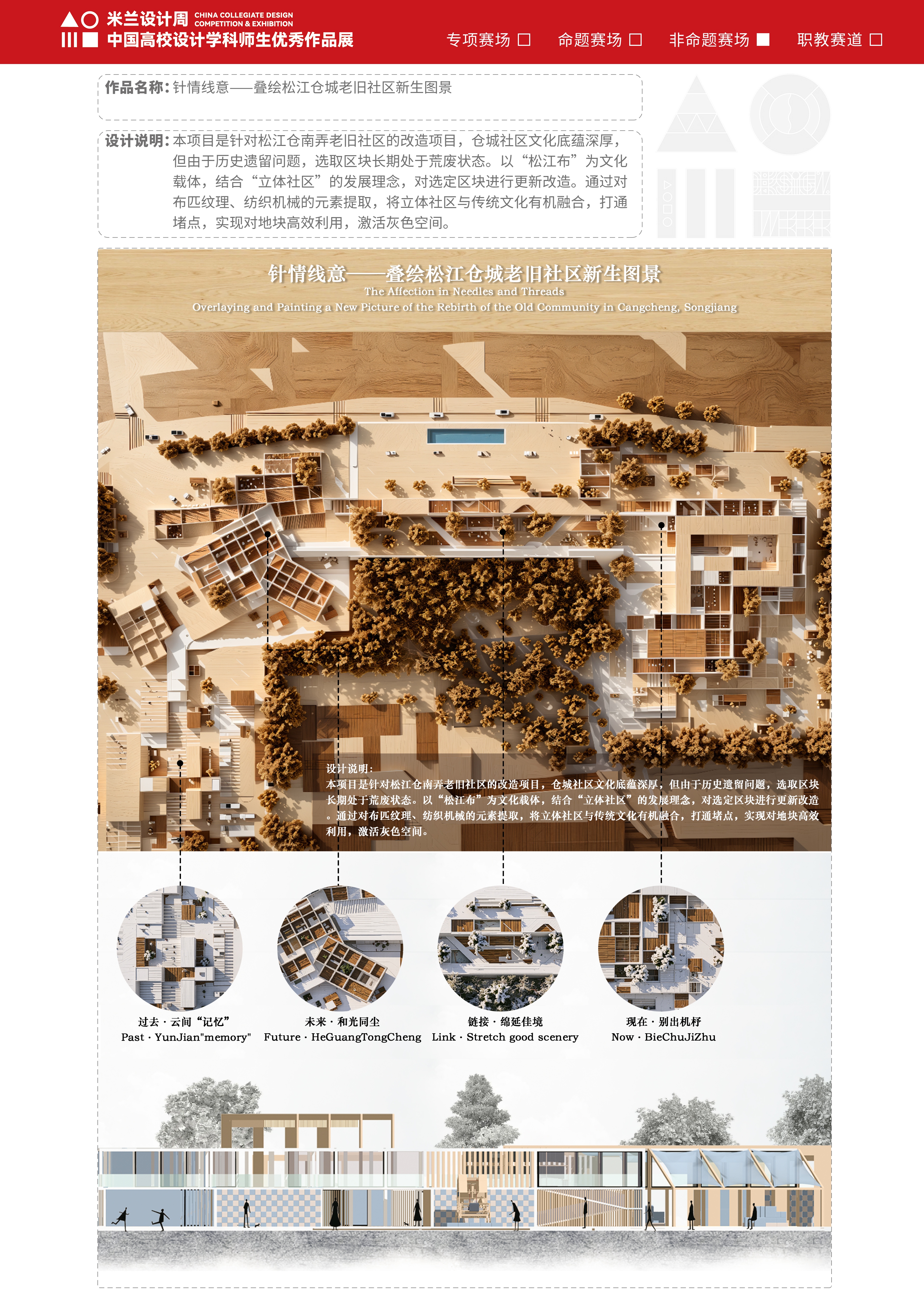 作品说明:本项目是针对松江仓南弄老旧社区的改造项目,仓城社区文化底蕴深厚,但由于历史遗留问题,选取区块长期处于荒废状态。以“松江布”为文化载体,结合“立体社区”的发展理念,对选定区块进行更新改造。通过对布匹纹理、纺织机械的元素提取,将立体社区与传统文化有机融合,打通堵点,实现对地块高效利用,激活灰色空间。