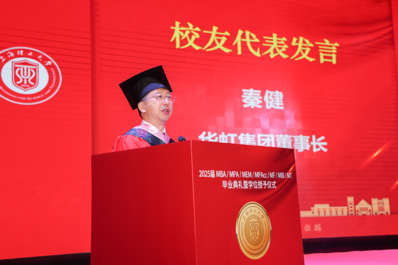 秦健作为校友代表,以“眼界、站位、定力”三个关键词寄语学弟学妹,希望大家勇于把握新一轮科技革命和产业变革机遇,坚定不移运用新理念、新科技催生新产业、新模式。管理学院教授、博士生导师钱颖作为教师代表送上临别赠言,鼓励大家勇敢前行,在未来的征途中留下自己独特而精彩的人生印记。2025届MBA付攀作为毕业生代表,回顾了在校期间经历压力、收获蜕变的难忘岁月,号召同学们迎难而上,以更快更坚定的姿态奔向属于自己的星辰大海。