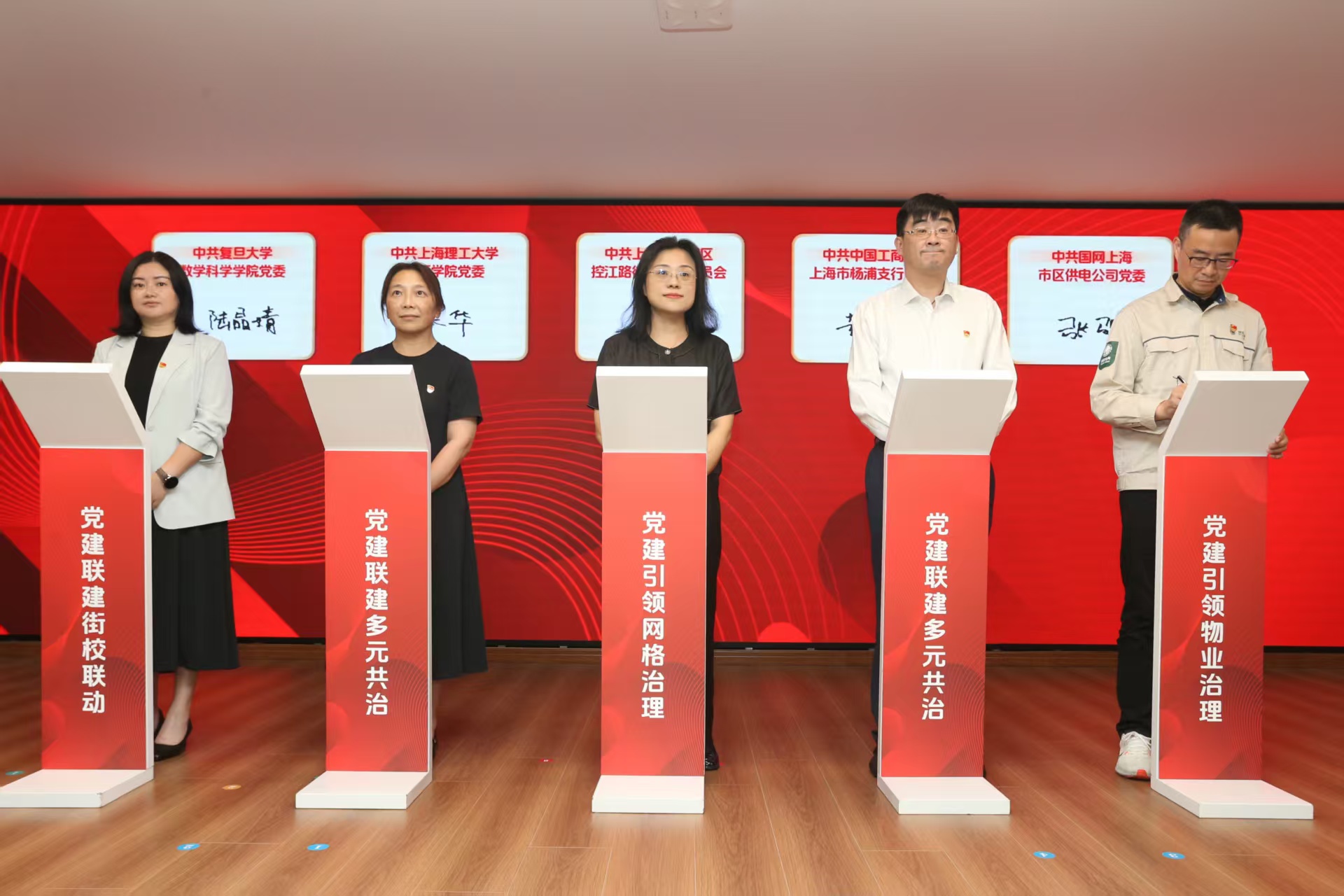 金沙官网出版学院党委与复旦大学数学科学学院党委、国网上海市区供电公司党委、中国工商银行上海市杨浦支行委员会和控江路街道党工委等五家单位党组织代表共同签署党建联建协议。