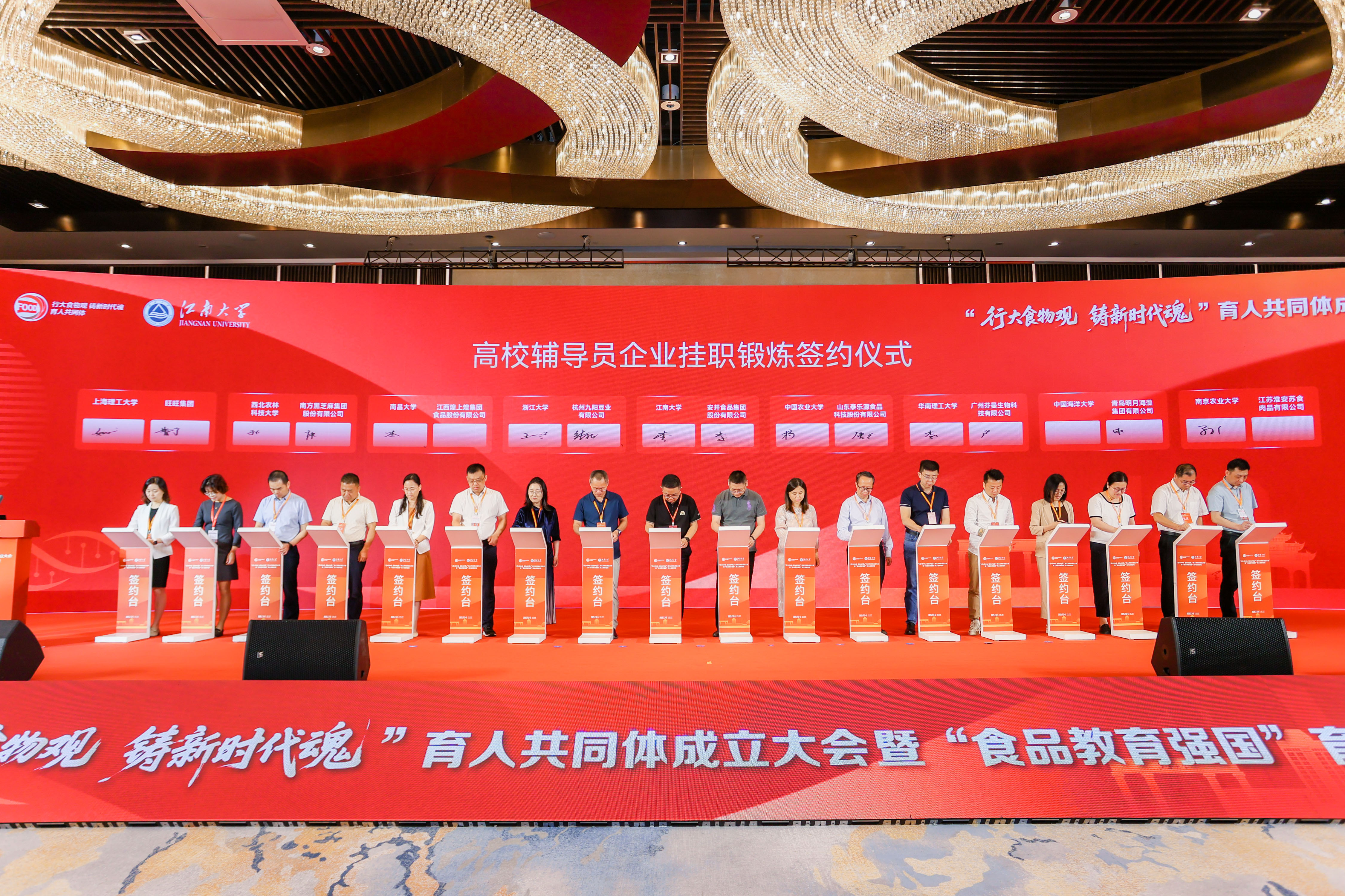 大会现场,包括健康学院在内的113家育人共同体成员单位代表共同签署《食品教育强国宣言》,发布《食品教育强国行动任务》。共同体聚焦教育强国建设,系统部署了14项“六力”提升行动任务。根据“食品思政引领力提升行动任务”部署,共同体发起全国高校食品学科辅导员能力提升计划。会上,姚秀雯与旺旺集团生产研发群总处长曹永梅签署《高校辅导员企业挂职锻炼合作协议》,学院将选派优秀辅导员赴旺旺集团开展挂职锻炼,深入了解食品行业前沿动态、企业管理模式及人才需求,为学院人才培养方案优化提供实践支撑。同时,旺旺集团将选派资深业务骨干担任学院“企业导师”,参与学生职业发展教育与行业技能指导,这标志着双方在产教融合、协同育人领域迈出关键一步。