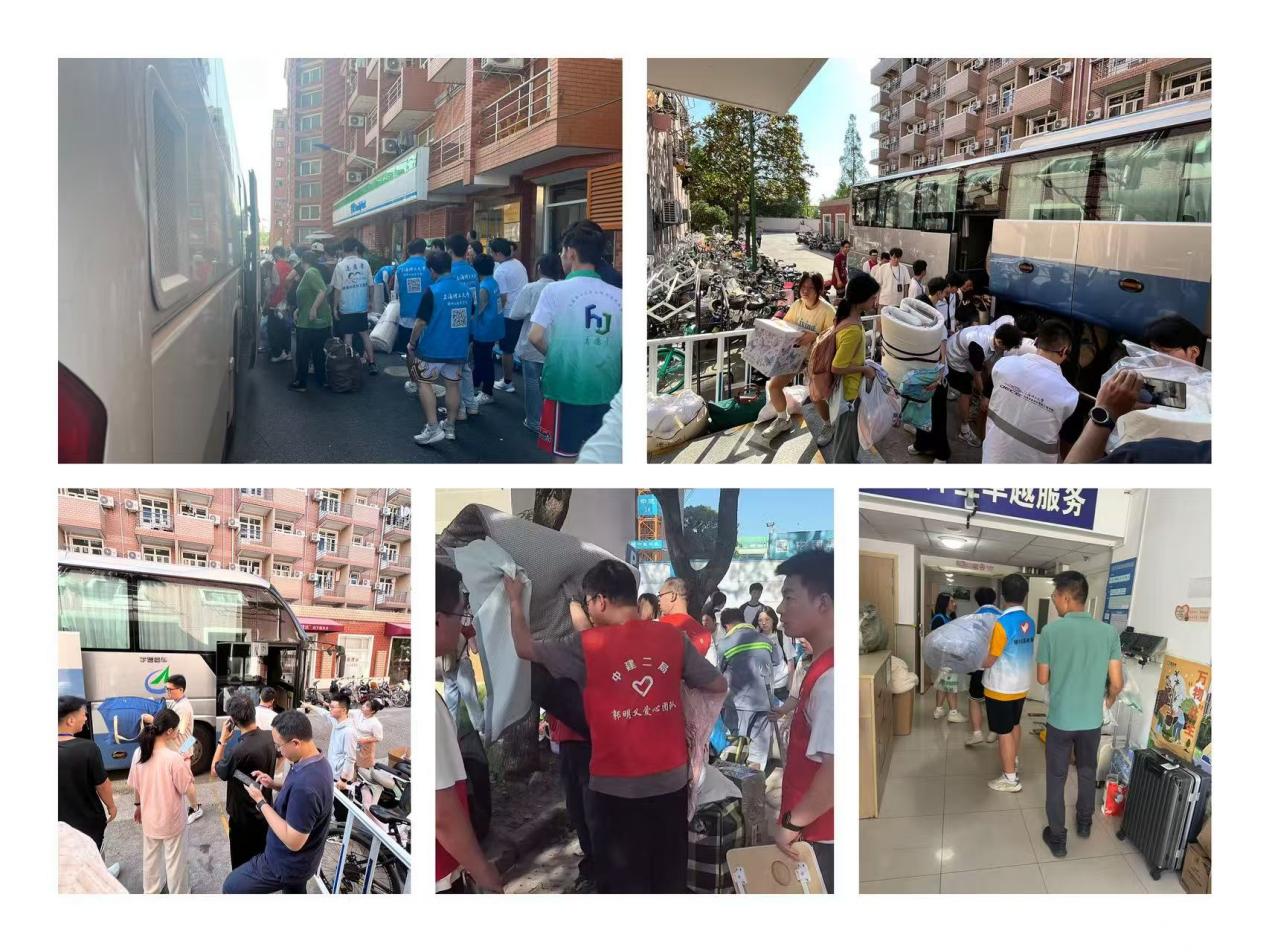 7月5日凌晨5点半,基础学院全体教职工、30余名保卫处工作人员、100余名后勤、物业人员和中建二局十位党员志愿者在1100号校区9个搬迁站点同步行动。大家分工明确,学院教职员工负责做好车辆整体调度、提醒学生提前整理、搬运行李、有序排队登车、协助安放行李,保卫处疏导交通保障道路畅通,后勤做好车辆、餐饮保障,物业增加宿管和保洁人员应对集中的登记和清理工作,中建二局党员志愿者团队重点帮扶女生转运重物。现场布设的补给点里,矿泉水、盐汽水码放整齐,医务科医护人员携带防中防暑药品随时待命。各兄弟学院在本部校区做好接车工作,志愿者穿梭于楼宇间帮助学生搬运行李,搬迁整个过程忙碌有序,细微之处尽显人文关怀。