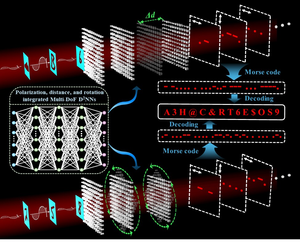 本研究针对传统衍射神经网络的自由度单一和功能集成度弱等问题,创新性地提出了基于多层超构表面多自由度融合的衍射神经网络新架构,通过集成偏振、距离和旋转三个自由度,提升了该架构的多任务并行处理容量。此外,基于Multi-DoFD22NNs构建了一套高安全性全光信息传输框架。每个通道相当于一个独立的密钥,从而将海量输入信息拆分并分配到不同的“偏振-距离-旋转”组合通道中,有效实现信息的加密。在输出层,相关信息被转换为对应的摩尔斯码图案,接收方必须同时掌握所有通道对应的完整密钥组合,才能准确地解码出原始信息。相关研究为光存储、隐私保护和网络通信提供了新范式。