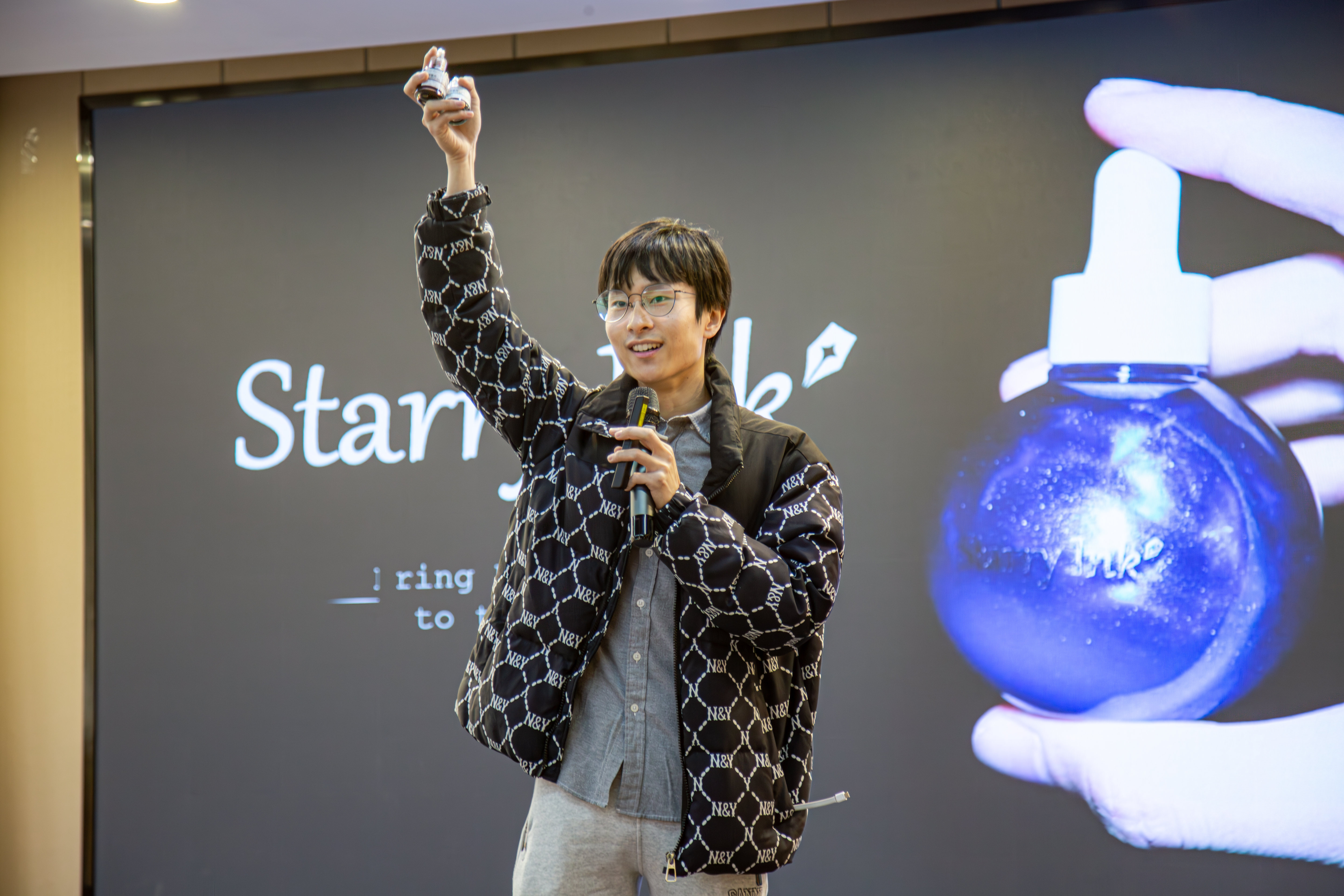 首场讲座以校友创业分享启幕。学院2015级校友、星墨StarryInk品牌创始人余昊源以“让世界‘写’满中国色彩:墨水品牌的创新与破圈”为题,讲述从校园实验室到国际市场的创业历程。他通过展示产品研发手稿、海外参展影像等资料,复盘企业战略转型路径,重点解析荣获国际奖项的“冷萃墨水系列”(Cold Brew Ink)如何将植物染料萃取技术与现代美学结合,开创墨水制造新范式,打造文化输出创新样本。余昊源还从创业者视角,为在校生梳理职业发展路径与团队分工逻辑,并针对创业初期关键问题提供实操建议,激发学生对创新与品牌国际化的深层思考。