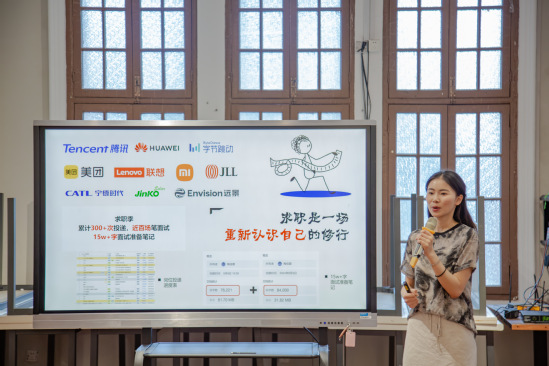 收官讲座由2023届校友梅佳蓉主讲,围绕申研与求职两大议题展开。在申研板块,她以时间轴拆解申请全流程,强调“早规划、早准备”的重要性,并通过案例解析个人陈述撰写要点及材料递交规范,分享规避风险的实用技巧。针对求职,梅佳蓉提出“岗位需求-个人优势双向匹配”方法论,结合自身实习经历,阐释如何通过数据量化成果、精准匹配关键词提升简历竞争力,并传授面试应答技巧。她以“实习是一场重新认识自己的修行”总结实践经验的价值,为学弟学妹指明职业探索方向。