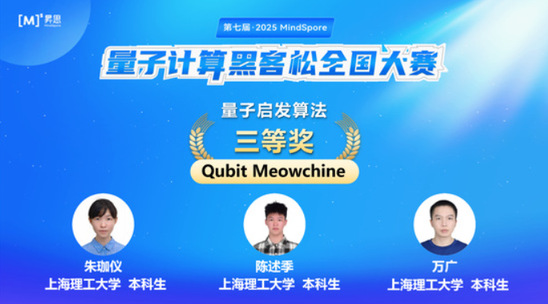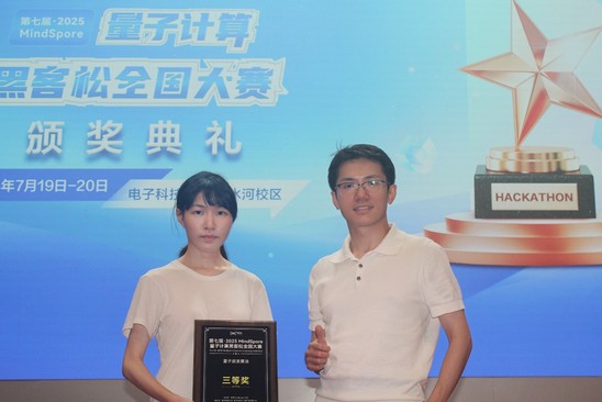 近日,华为MindSpore第七届量子计算黑客松全国总决赛在电子科技大学清水河校区举办,来自全国各地的高校团队和科研机构齐聚一堂,共同参与本次赛事。经过为期4个多月的激烈比拼,智能科技学院格致创新班本科生朱珈仪、陈述季、万广组成的团队在量子启发算法赛道中斩获三等奖。团队的指导老师是学院李蔚特聘研究员。