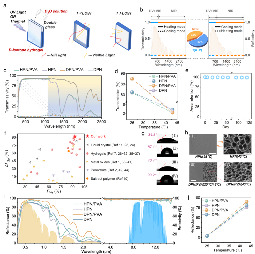 近日,智能科技学院顾敏院士团队成员特聘副研究员王彤联合复旦大学武利民教授在《自然·通讯》(Nature Communications)上发表了题为“同位素驱动水凝胶智能窗实现自适应温度调控”(Isotope-driven hydrogelsmart windows for self-adaptive thermoregulation”)的研究成果。全球建筑能耗约占总能耗的40%,并产生约33%的温室气体排放。作为建筑围护结构中最薄弱的部分,窗户导致了约60%的能量损失,这与传统窗户能效不足及现代建筑高窗墙比密切相关。因此,降低建筑热负荷对于应对气候变化和实现碳中和目标至关重要。热致变色水凝胶智能窗以其零能耗和动态调光能力,成为实现建筑被动式节能的可持续解决方案。然而,H2O对近红外(NIR)能量的显著吸收,严重制约了光谱响应性能的提升。