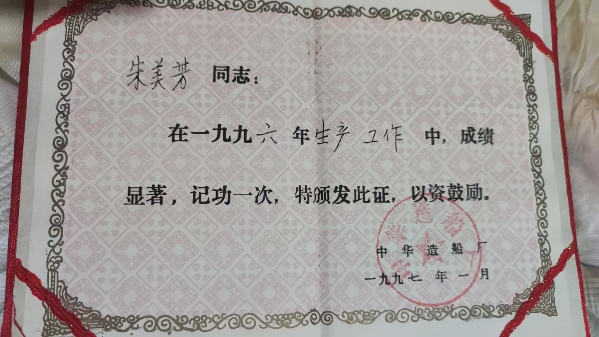 朱美芳获奖证书