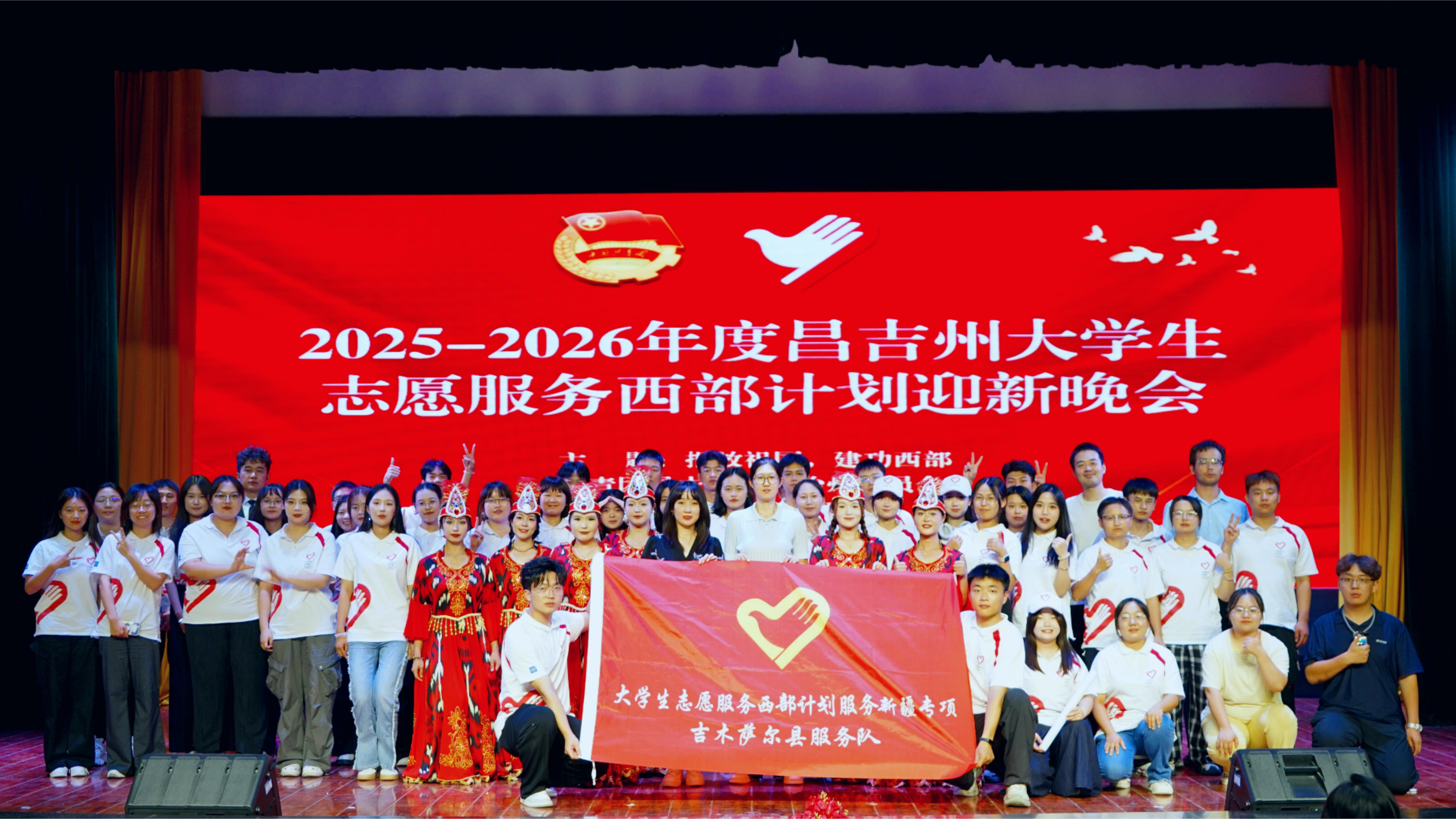 丁新宇(拉横幅右)参加西部计划迎新晚会