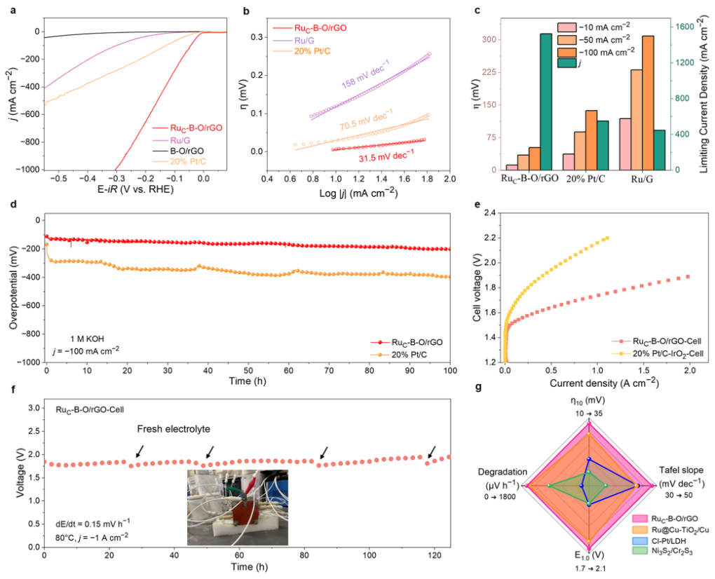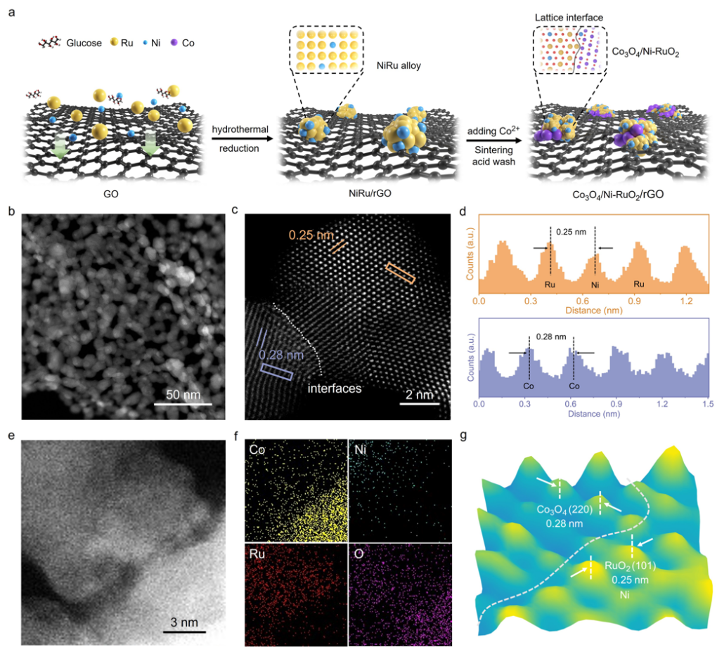 以上方案有效解决了电解水产氢技术成本高、效率低和循环寿命短的核心难题,实现了催化剂成本降低至25%,产氢效率提高了约13倍和连续循环运行100h无衰减的功效。此外,通过引入镍原子掺杂二氧化钌和氧化钴异质结构设计(图1),进一步降低了催化剂的过电位(η10 =195 mV)并提高了钌的溶解保持率(100 mg/cm2电流密度下循环20小时,保持率高达94.1%),实现活性与稳定性的统一。在模拟实际工况AEMWEs测试中,催化剂在产氢电流密度为1 A/cm2时的电位仅为1.73 V,且钌贵金属的载量仅为0.1 mg/cm2,综合性能优于2024年美国能源部的具体要求(图2)。
