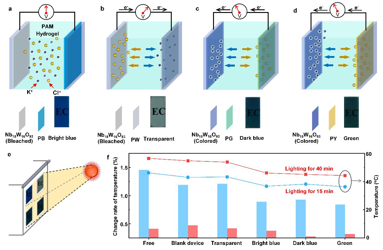通常,电致变色智能窗是通过离子在材料中的嵌入/脱出,伴随着电子的转移,来实现着色态和褪色态的切换。然而,现有的研究长期局限于“摇椅式”的阳离子(如H⁺、Li⁺、Zn2+)的嵌入/脱出机制,而忽视了阴离子的作用,导致相关机理不清晰。为此,研究人员首次证明了阴离子(F-、Cl-、Br-、SO42-)可以在普鲁士蓝薄膜中嵌入与脱出,并设计了基于普鲁士蓝和铌钨双金属氧化物(Nb18W16O93)的电致变色器件,其中变色源于K+的嵌入与脱出。