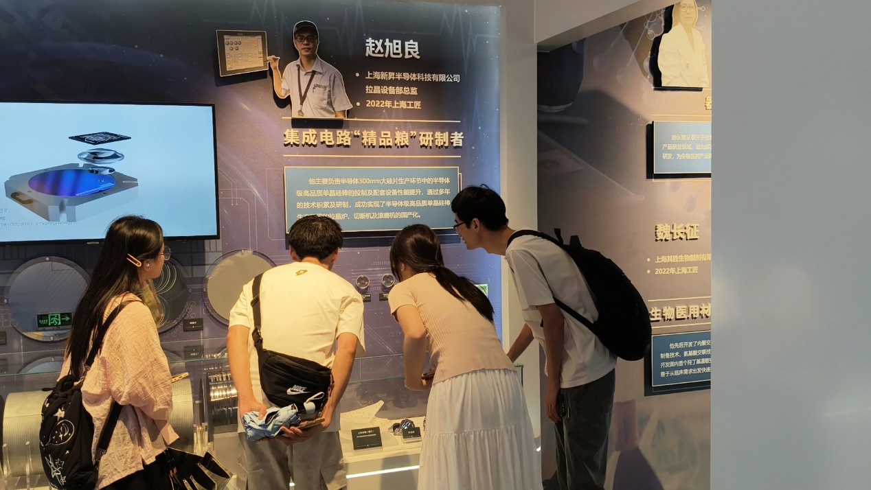 一进入上海工匠馆,石英坩埚碎片、多晶硅和单晶硅等芯片制造原始基石样品便吸引了队员目光。墙上播放的芯片制造全流程视频,生动展示从“生产单晶硅棒”到“芯片封装”的十一步工序,诠释砂粒蜕变为“工业粮食”的过程。在这里,队员们了解到2022年上海工匠赵旭良实现单晶硅棒关键生产设备国产化的突破,以及2021年上海工匠李冰寒主导开发多个技术节点闪存工艺平台的故事。实物、视频与工匠故事的交织,让队员深刻认识到,半导体自主之路既需高深理论,更依赖工匠对“精微”的极致追求和对“卡脖子”难题的不懈攻坚。