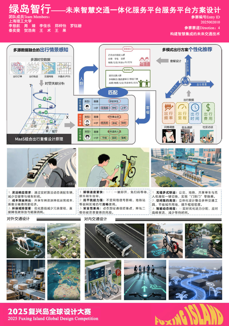 依托于李文翔课题组的研究成果,交通运输专业硕士研究生李慈航、周婧、李佳乐,交通工程专业本科生罗钰姗、贺浩南、王术、王果等同学,聚焦“构建智慧集成的未来交通技术”赛道,以“出行即服务(Mobility as a Service, MaaS)”为理念,设计了“水—陆—空”多维协同的复兴岛未来智慧交通一体化服务平台方案,涵盖智能轮渡、水上巴士、自动驾驶接驳车、液态公交、无人机客货运等多种新型交通方式,并集成旅游订票、生活消费、低碳积分等增值服务,开发面向不同用户群体的个性化MaaS套餐,旨在为复兴岛居民与游客提供一站式智慧出行体验。
